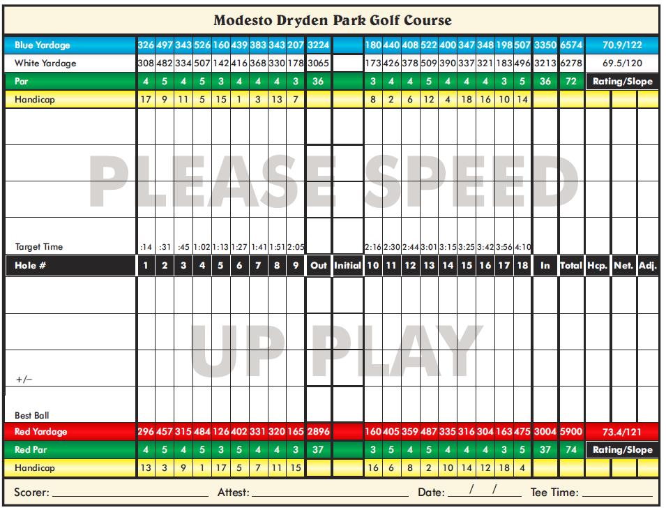 Dryden Park Golf Course winds along the Tuolumne River in Modesto, California and is one of Northern California’s Best Golf Values. Encompassing mature pines and oaks, and wide, emerald fairways, both beginners and expert golfers who prefer a more traditional round of golf will appreciate Dryden Park’s medium-sized greens guarded by small bunkers. Dryden Park Golf Course’s practice facility has two practice putting greens and a driving range perfect for both learning and/or tuning up your golf game
